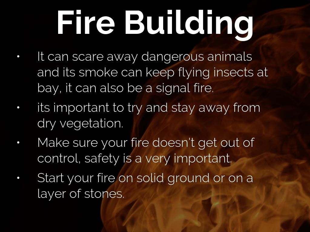 • It can scare away dangerous animals and its smoke can keep flying insects at bay, it can also be a signal fire.