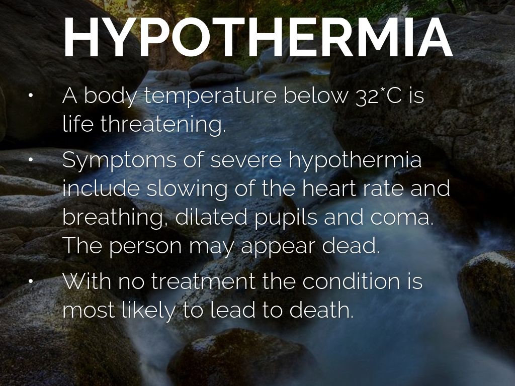 • Symptoms of severe hypothermia include slowing of the heart rate and breathing, dilated pupils and coma. The person may appear dead.