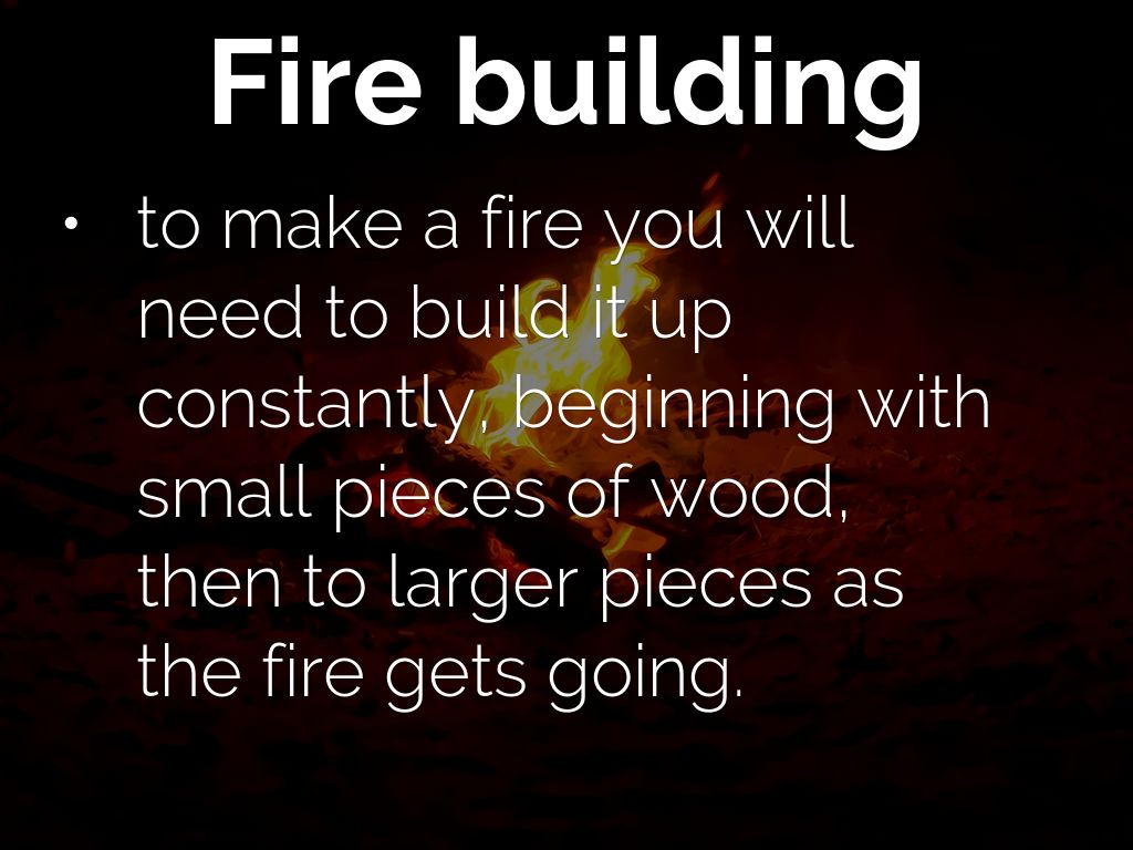 • to make a fire you will need to build it up constantly, beginning with small pieces of wood, then to larger pieces as the fire gets going.
