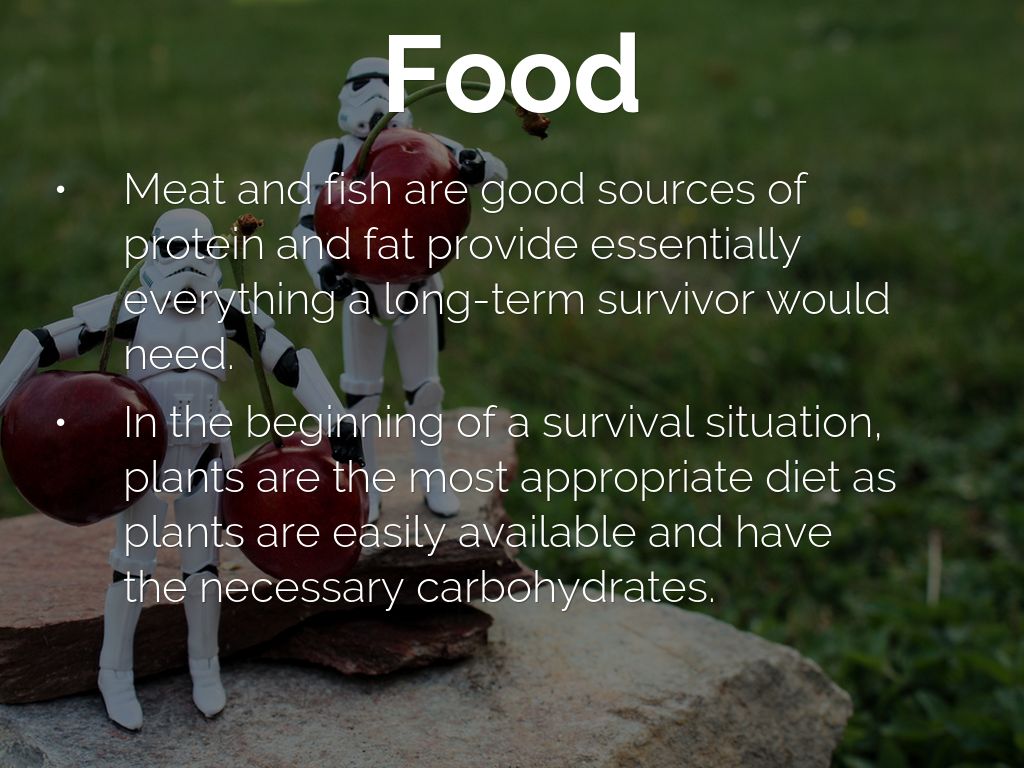 • Meat and fish are good sources of protein and fat provide essentially everything a long-term survivor would need.
