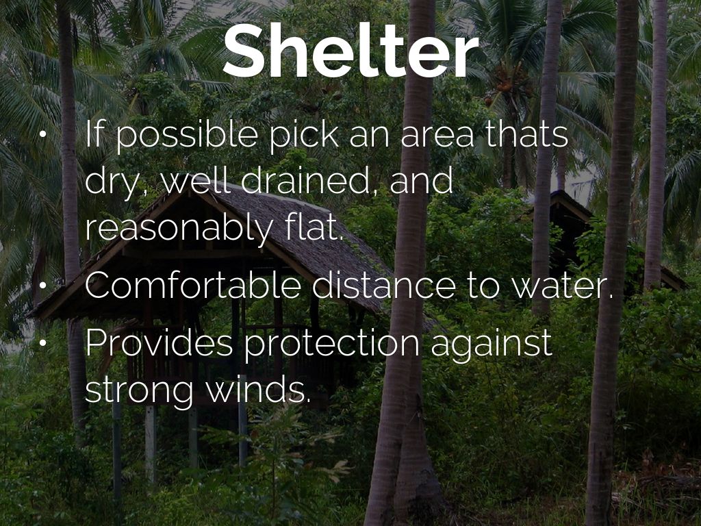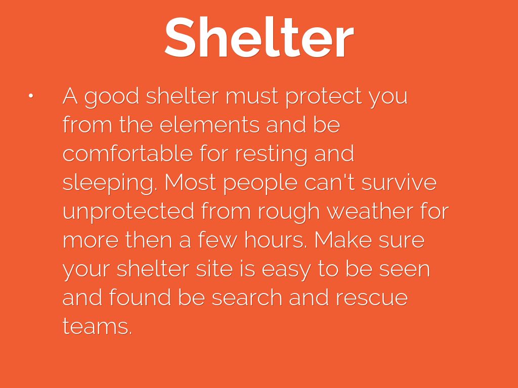 • A good shelter must protect you from the elements and be comfortable for resting and sleeping. Most people can't survive unprotected from rough weather for more then a few hours. Make sure your shelter site is easy to be seen and found be search and rescue teams.
