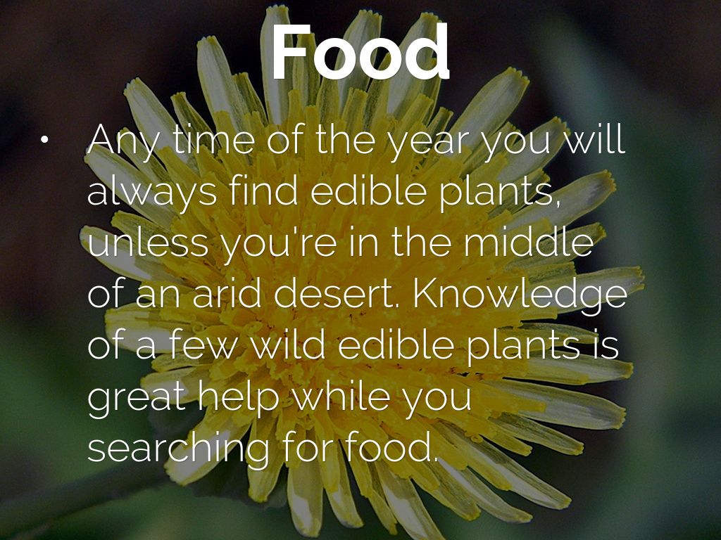 • Any time of the year you will always find edible plants, unless you're in the middle of an arid desert. Knowledge of a few wild edible plants is great help while you searching for food.