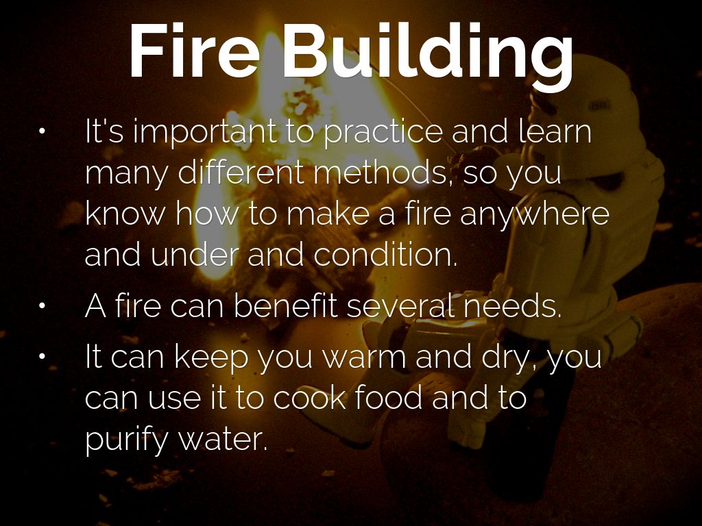 • It's important to practice and learn many different methods, so you know how to make a fire anywhere and under and condition.