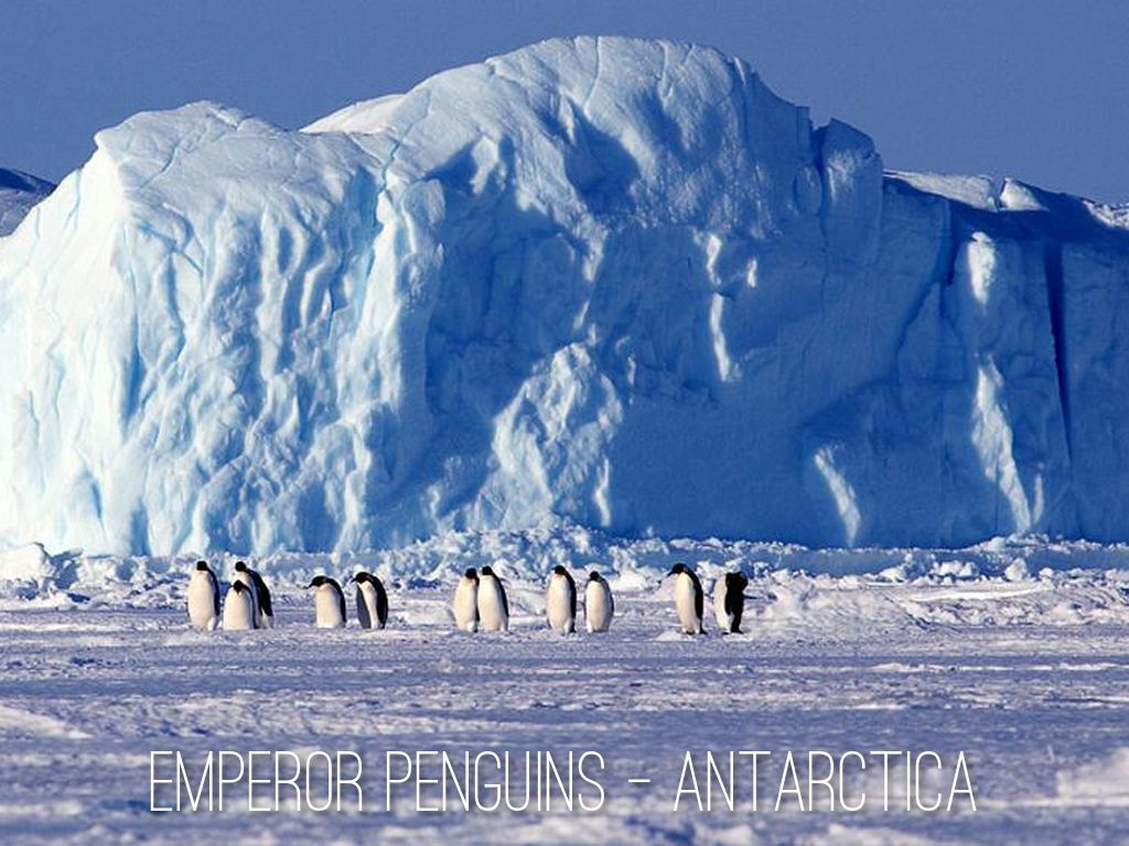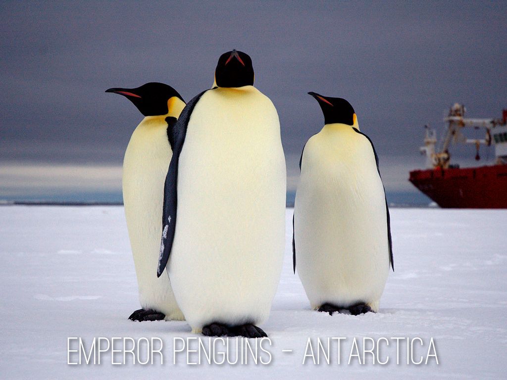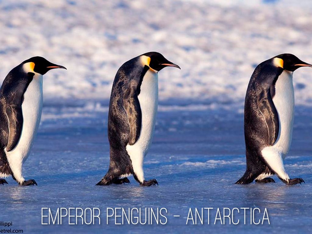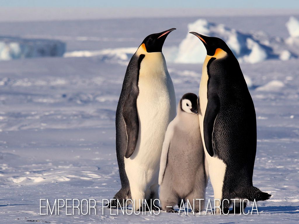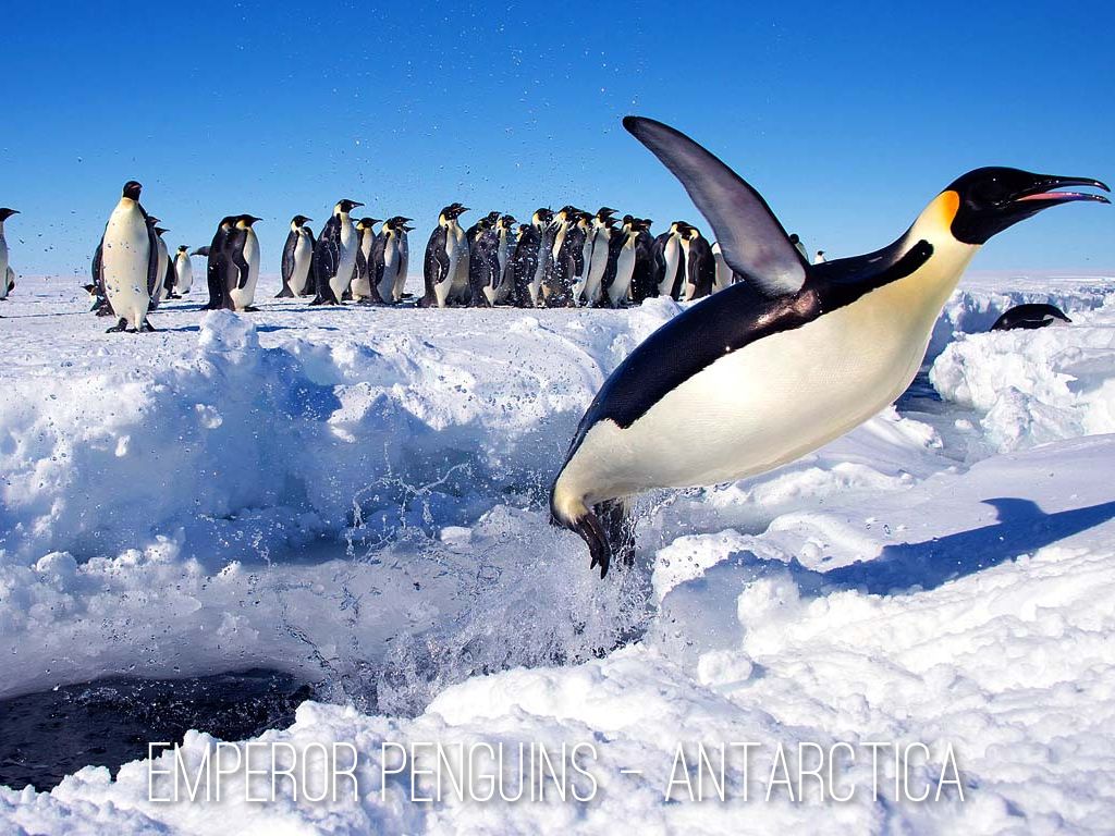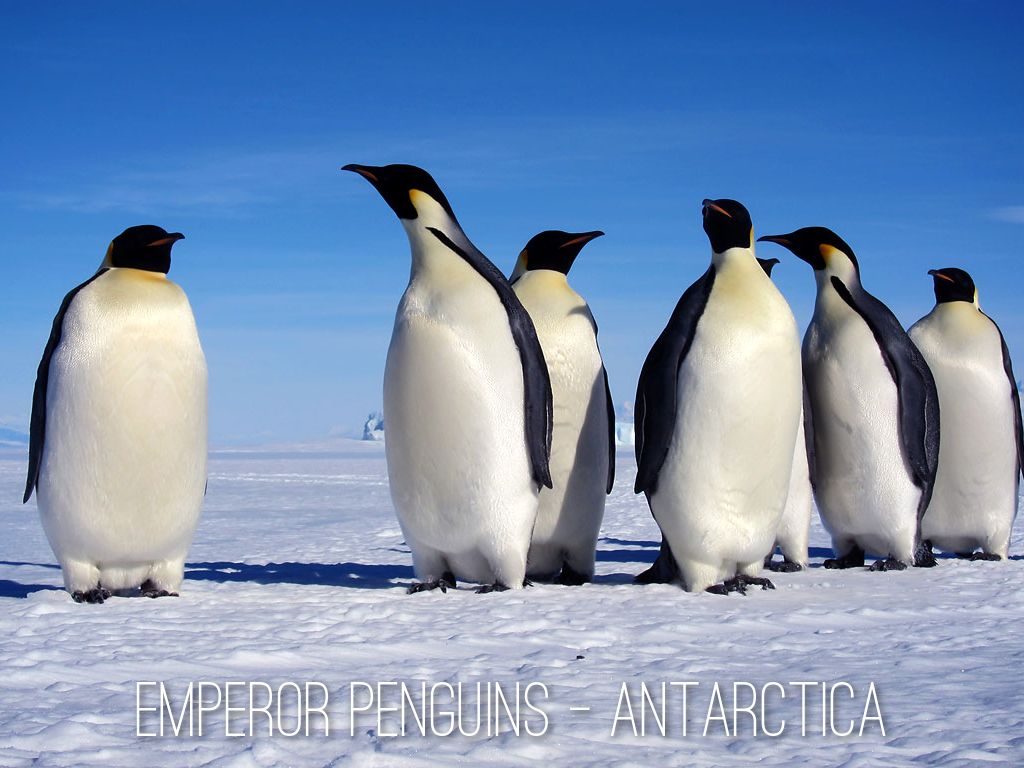 Endemic of Antarctica, Emperor penguins are the tallest of all species of penguins. They reach over one meter, weighing up to 45 kg (99 lb) and considered to be the only animal to inhabit the open ice of Antarctica during the winter, facing temperatures as cold as -60°C (-76°F) and blizzards of 200 km/h (124 mph). Excellent swimmers, they can dive deeper than any other bird – as deep as 565 m (1850 ft.) – and they can stay under for more than 20 minutes.