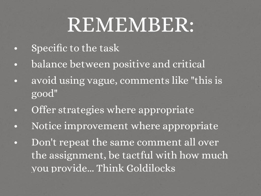Don't repeat the same comment all over the assignment, be tactful with how much you provide... Think Goldilocks