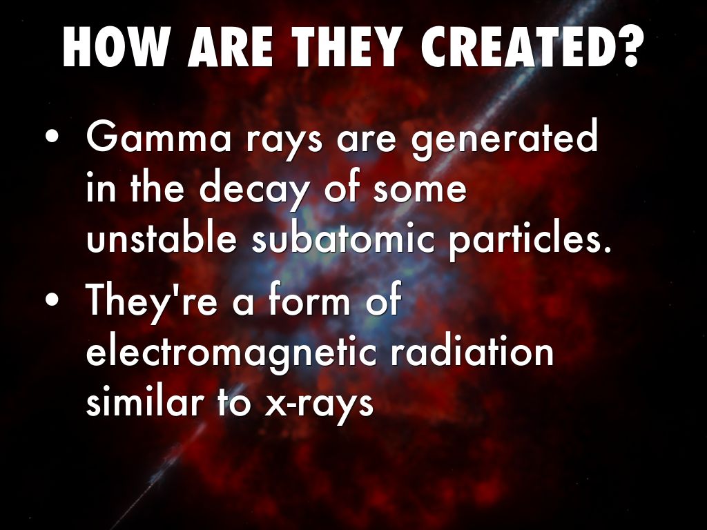 Gamma rays are generated in the decay of some unstable subatomic particles.