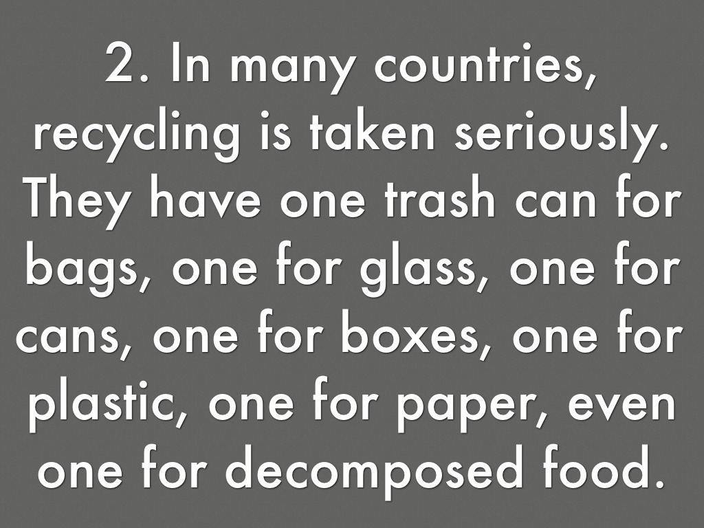 2. In many countries, recycling is taken seriously. They have one trash can for bags, one for glass, one for cans, one for boxes, one for plastic, one for paper, even one for decomposed food.