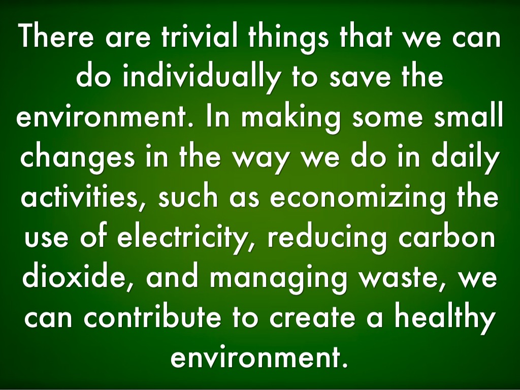 There are trivial things that we can do individually to save the environment. In making some small changes in the way we do in daily activities, such as economizing the use of electricity, reducing carbon dioxide, and managing waste, we can contribute to create a healthy environment.
