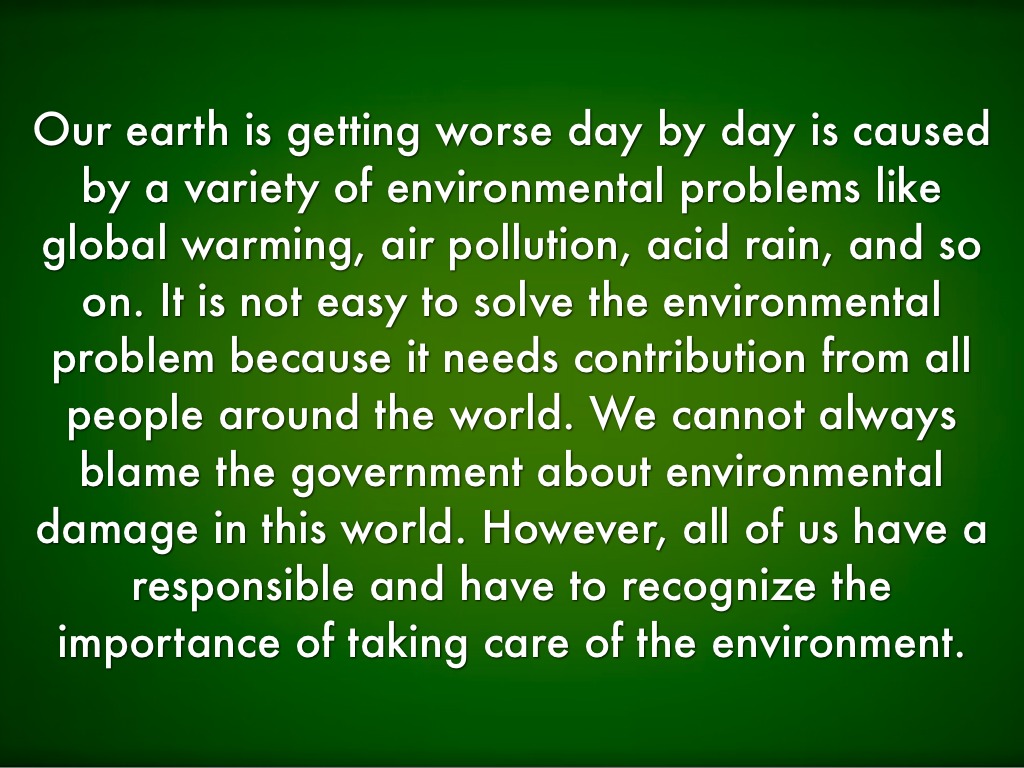 Our earth is getting worse day by day is caused by a variety of environmental problems like global warming, air pollution, acid rain, and so on. It is not easy to solve the environmental problem because it needs contribution from all people around the world. We cannot always blame the government about environmental damage in this world. However, all of us have a responsible and have to recognize the importance of taking care of the environment.