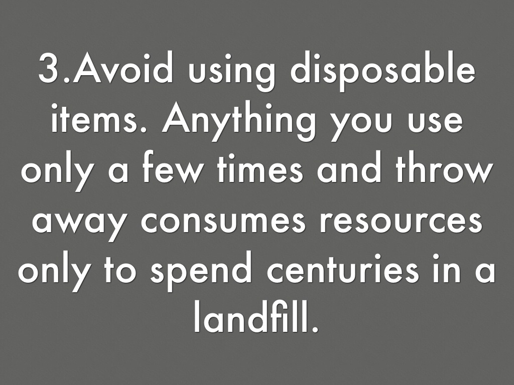 3.Avoid using disposable items. Anything you use only a few times and throw away consumes resources only to spend centuries in a landfill.