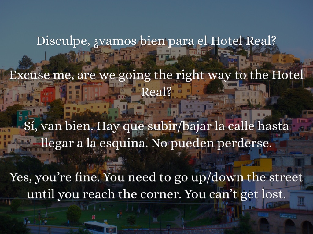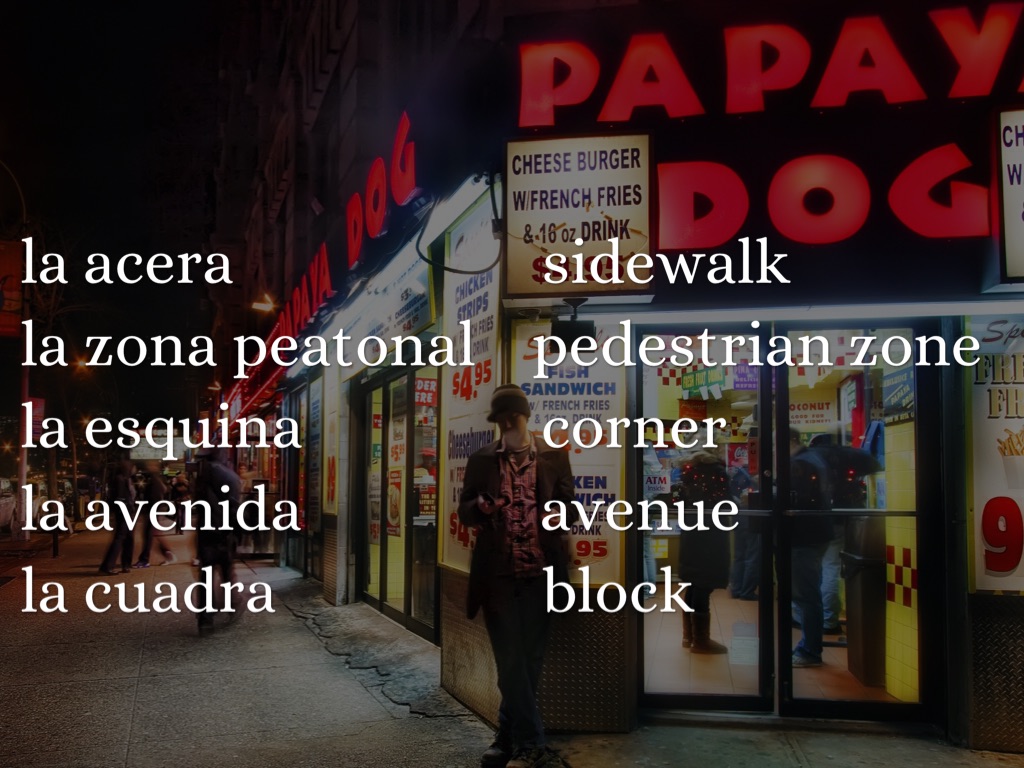 Siga adelante/derecho dos cuadras. Doble a la izquierda en el cruce de... con... Go straight for two blocks. Turn left at the intersection of . . . and . . .