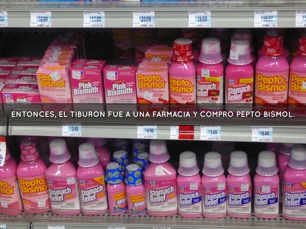 ENTONCES, EL TIBURÓN FUE A UNA FARMACIA Y COMPRO PEPTO BISMOL.
