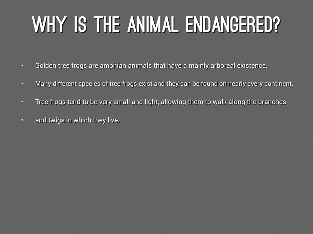 • Golden tree frogs are amphian animals that have a mainly arboreal existence.