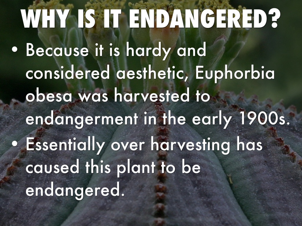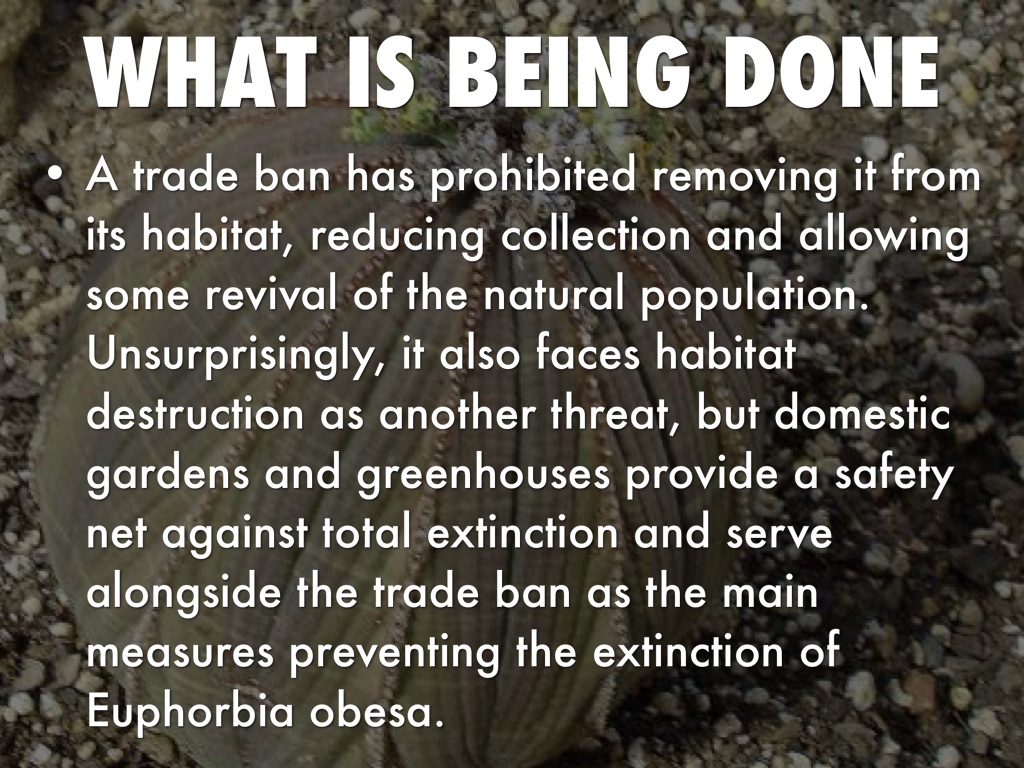 A trade ban has prohibited removing it from its habitat, reducing collection and allowing some revival of the natural population. Unsurprisingly, it also faces habitat destruction as another threat, but domestic gardens and greenhouses provide a safety net against total extinction and serve alongside the trade ban as the main measures preventing the extinction of Euphorbia obesa.