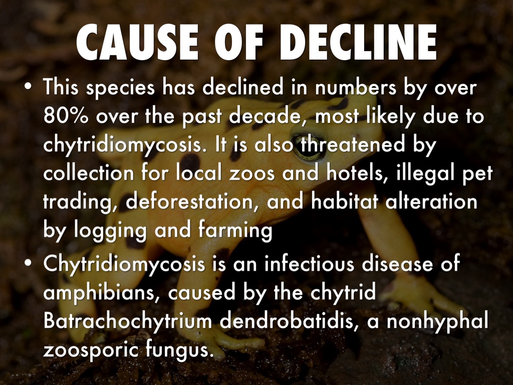 This species has declined in numbers by over 80% over the past decade, most likely due to chytridiomycosis. It is also threatened by collection for local zoos and hotels, illegal pet trading, deforestation, and habitat alteration by logging and farming