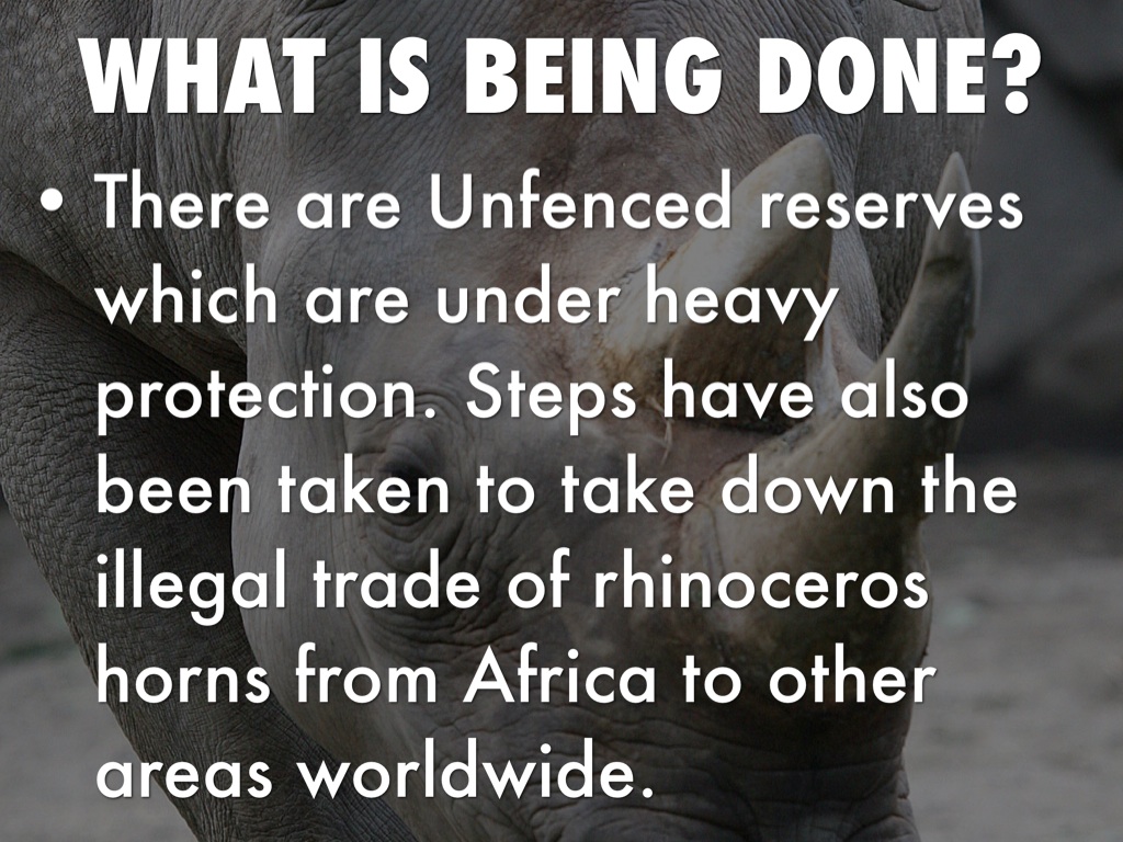 There are Unfenced reserves which are under heavy protection. Steps have also been taken to take down the illegal trade of rhinoceros horns from Africa to other areas worldwide.