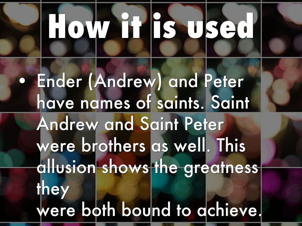 Ender (Andrew) and Peter have names of saints. Saint Andrew and Saint Peter were brothers as well. This allusion shows the greatness they