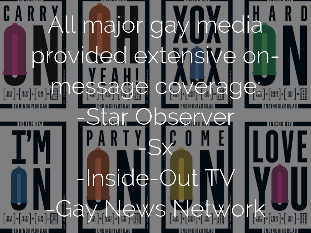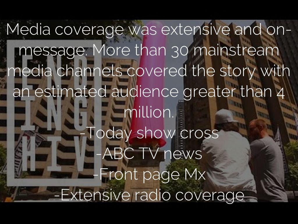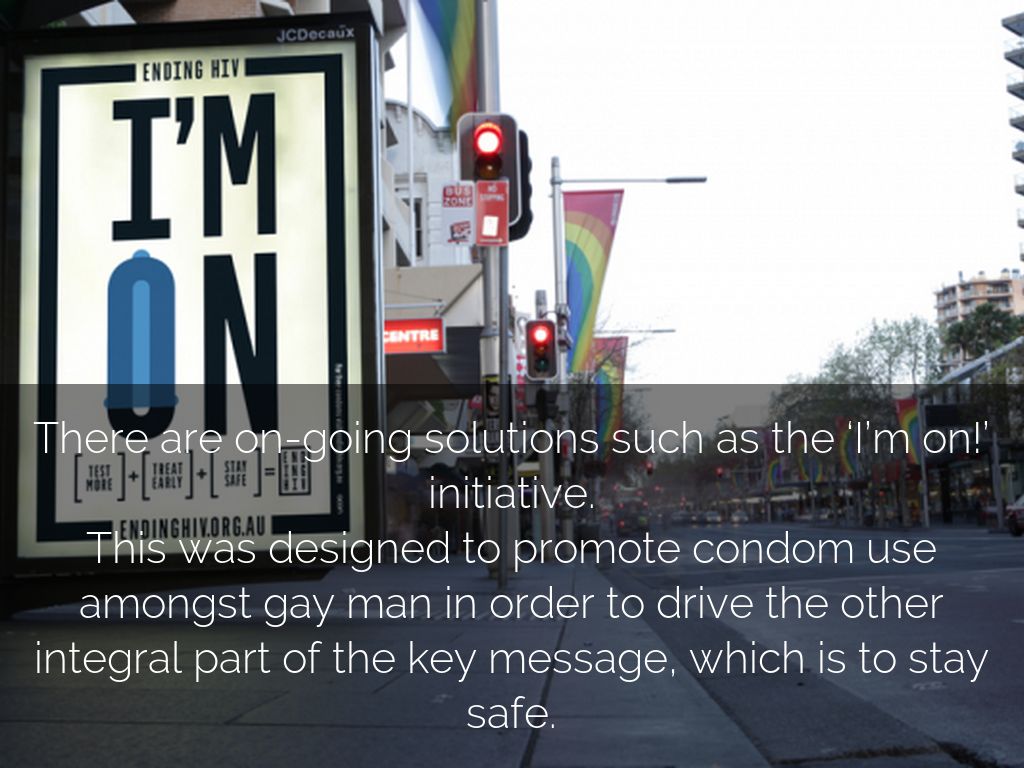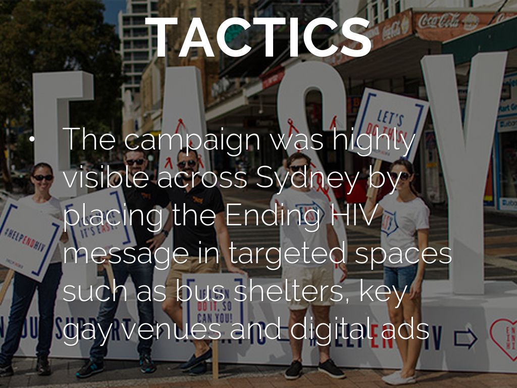 - The campaign was highly visible across Sydney by placing the Ending HIV message in targeted spaces such as bus shelters, key gay venues and digital ads