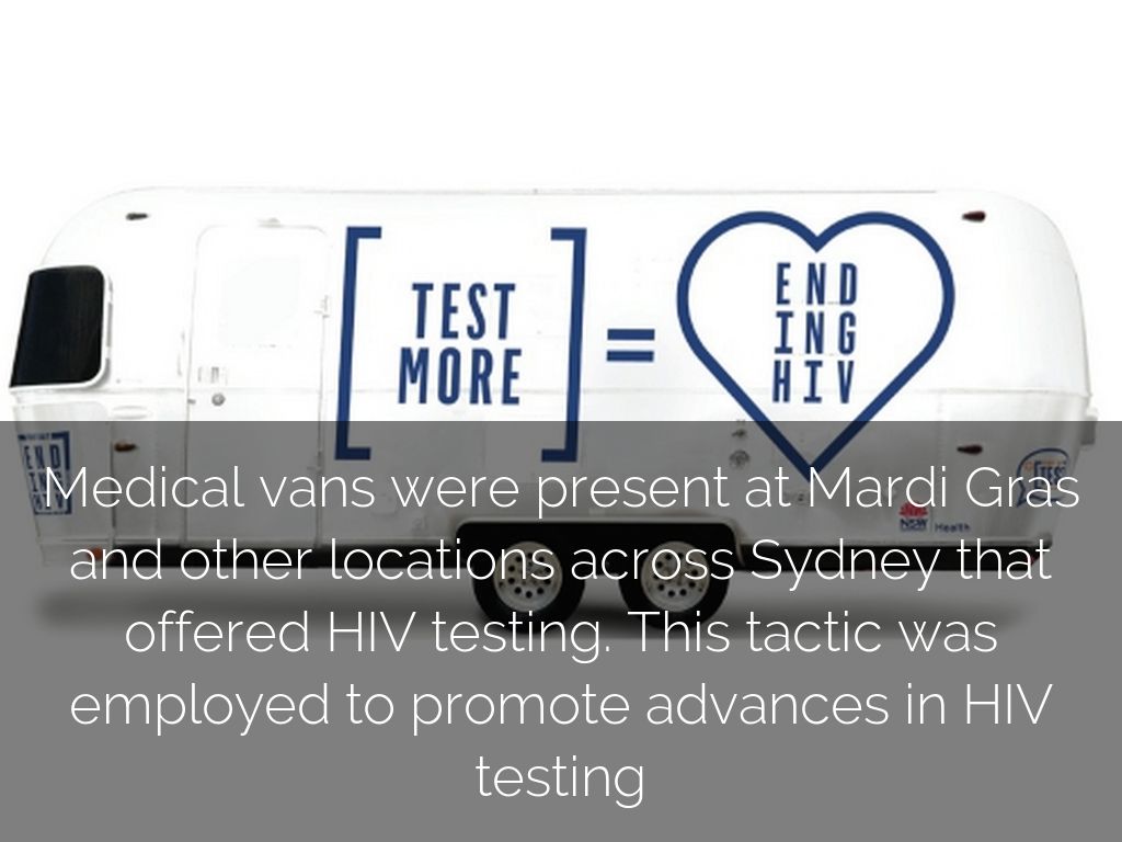 Medical vans were present at Mardi Gras and other locations across Sydney that offered HIV testing. This tactic was employed to promote advances in HIV testing