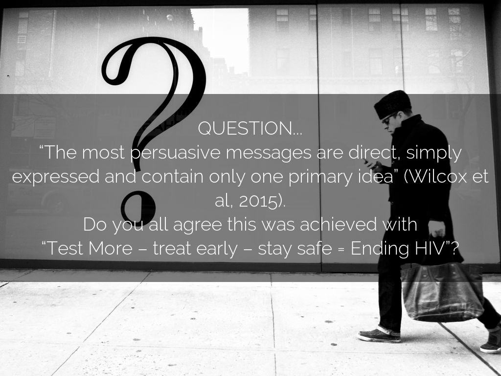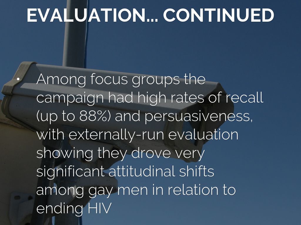 - Among focus groups the campaign had high rates of recall (up to 88%) and persuasiveness, with externally-run evaluation showing they drove very significant attitudinal shifts among gay men in relation to ending HIV