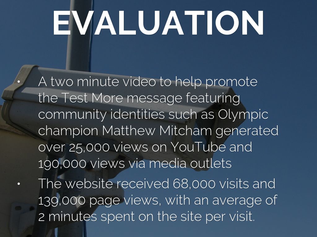 - A two minute video to help promote the Test More message featuring community identities such as Olympic champion Matthew Mitcham generated over 25,000 views on YouTube and 190,000 views via media outlets
