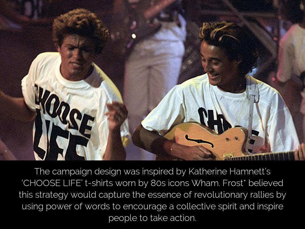 The campaign design was inspired by Katherine Hamnett’s ‘CHOOSE LIFE’ t-shirts worn by 80s icons Wham. Frost* believed this strategy would capture the essence of revolutionary rallies by using power of words to encourage a collective spirit and inspire people to take action.