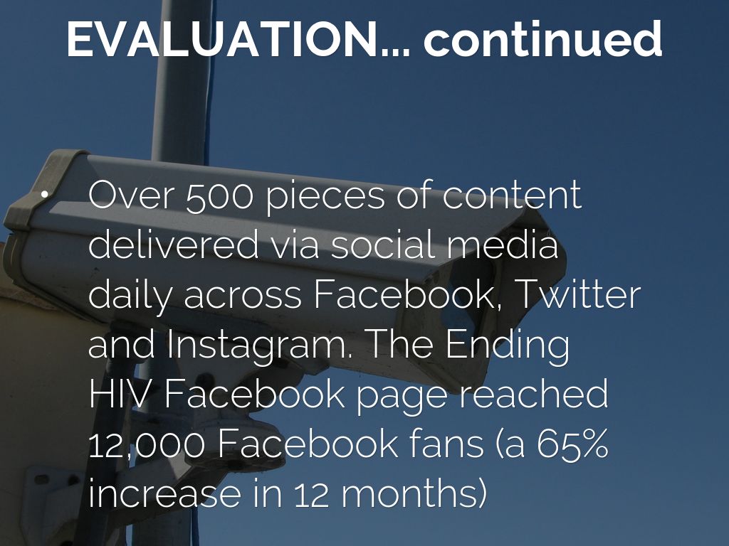 - Over 500 pieces of content delivered via social media daily across Facebook, Twitter and Instagram. The Ending HIV Facebook page reached 12,000 Facebook fans (a 65% increase in 12 months)