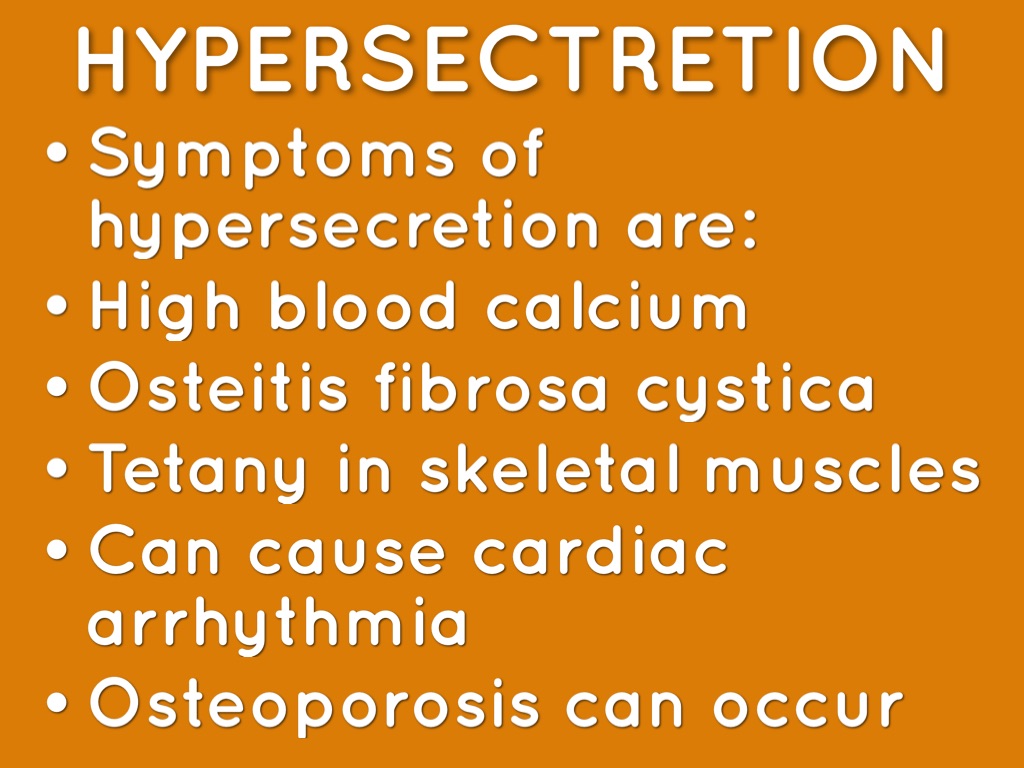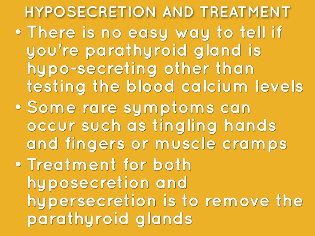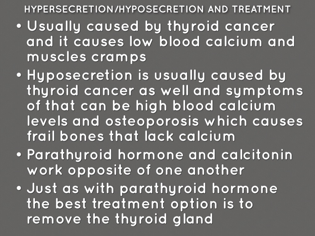 Hyposecretion is usually caused by thyroid cancer as well and symptoms of that can be high blood calcium levels and osteoporosis which causes frail bones that lack calcium
