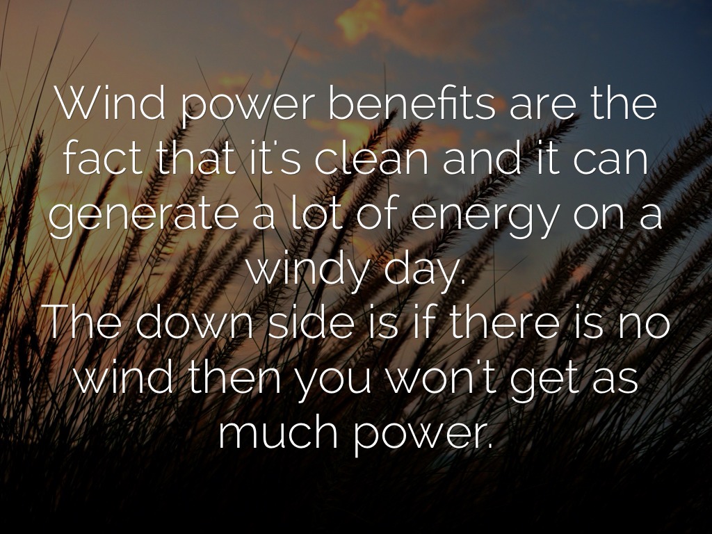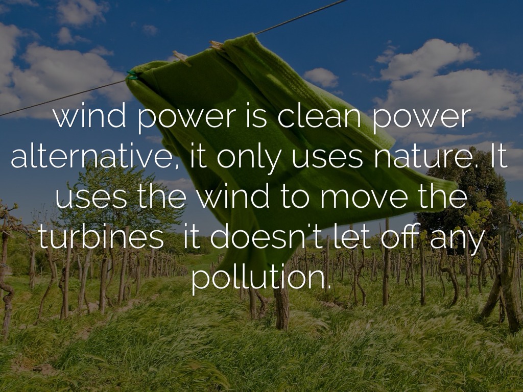 wind power is clean power alternative, it only uses nature. It uses the wind to move the turbines it doesn't let off any pollution.