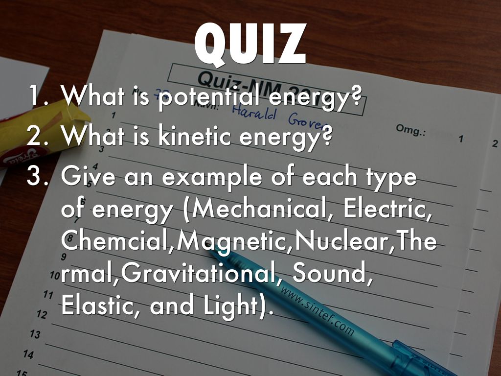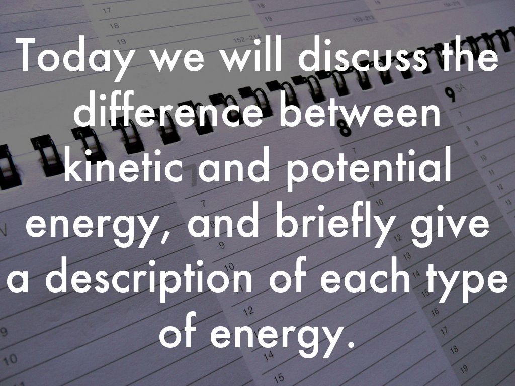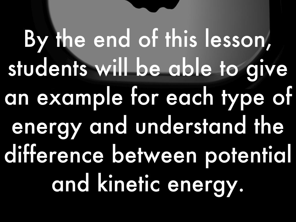 By the end of this lesson, students will be able to give an example for each type of energy and understand the difference between potential and kinetic energy.