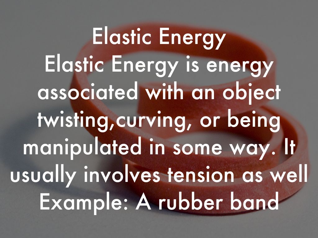 Elastic Energy Elastic Energy is energy associated with an object twisting,curving, or being manipulated in some way. It usually involves tension as well Example: A rubber band
