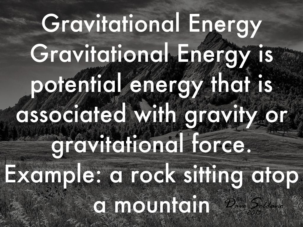 Gravitational Energy Gravitational Energy is potential energy that is associated with gravity or gravitational force. Example: a rock sitting atop a mountain