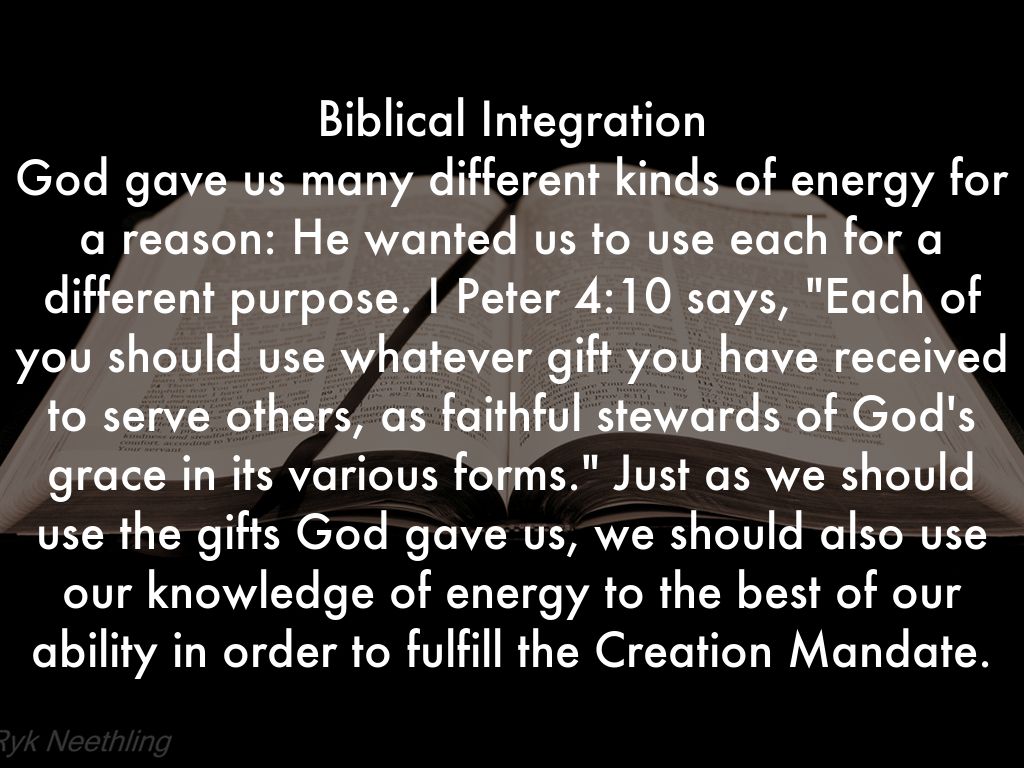Biblical Integration God gave us many different kinds of energy for a reason: He wanted us to use each for a different purpose. I Peter 4:10 says, "Each of you should use whatever gift you have received to serve others, as faithful stewards of God's grace in its various forms." Just as we should use the gifts God gave us, we should also use our knowledge of energy to the best of our ability in order to fulfill the Creation Mandate.