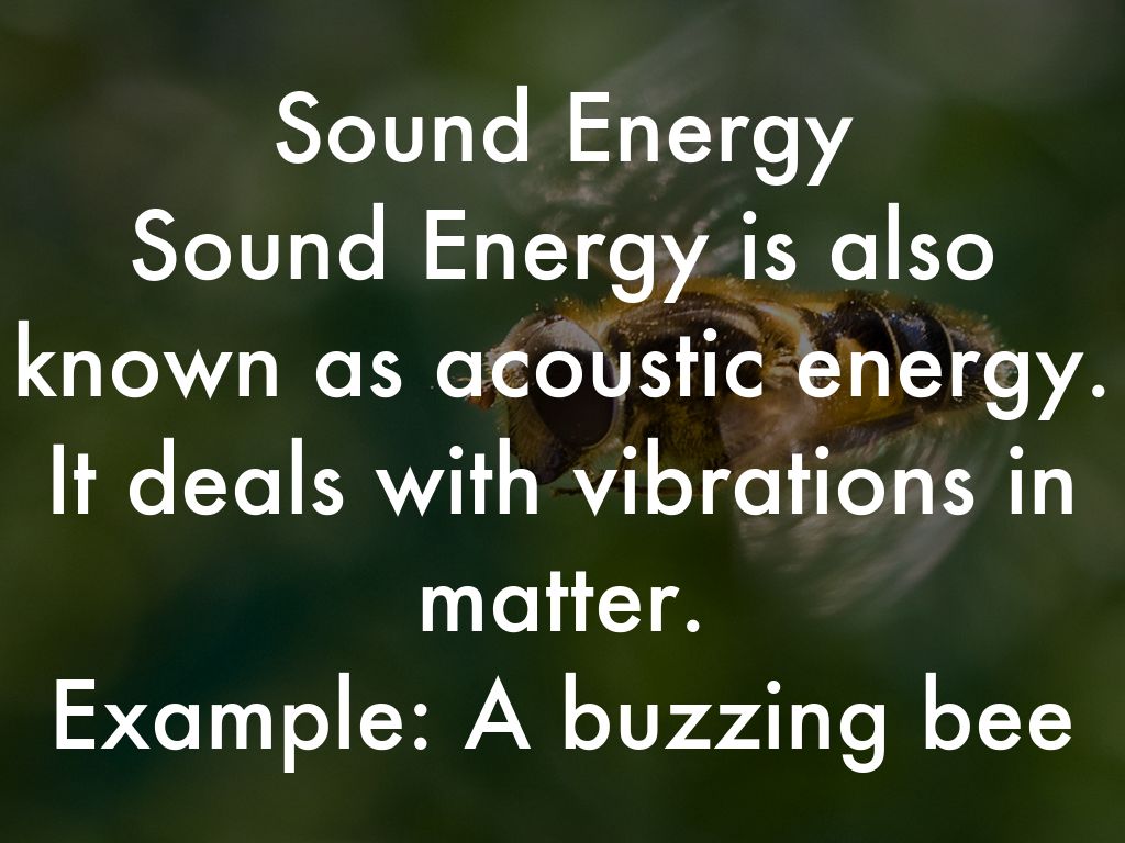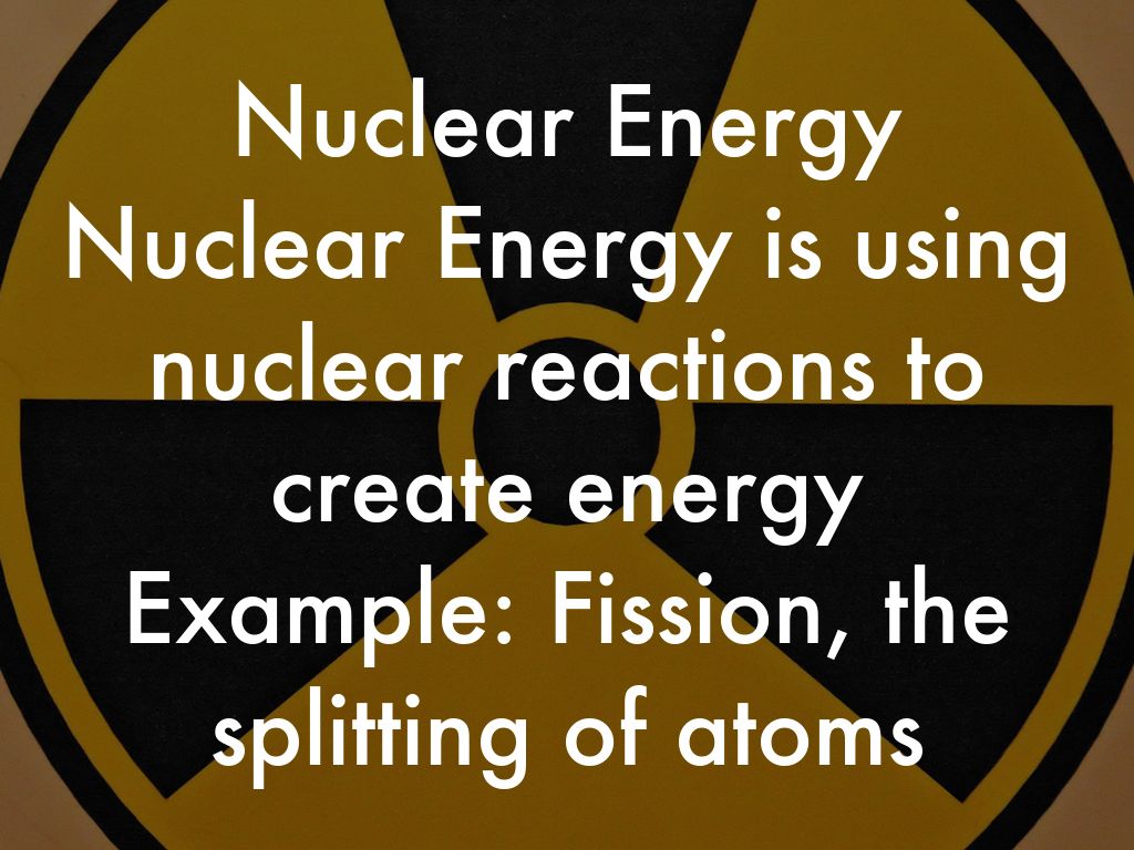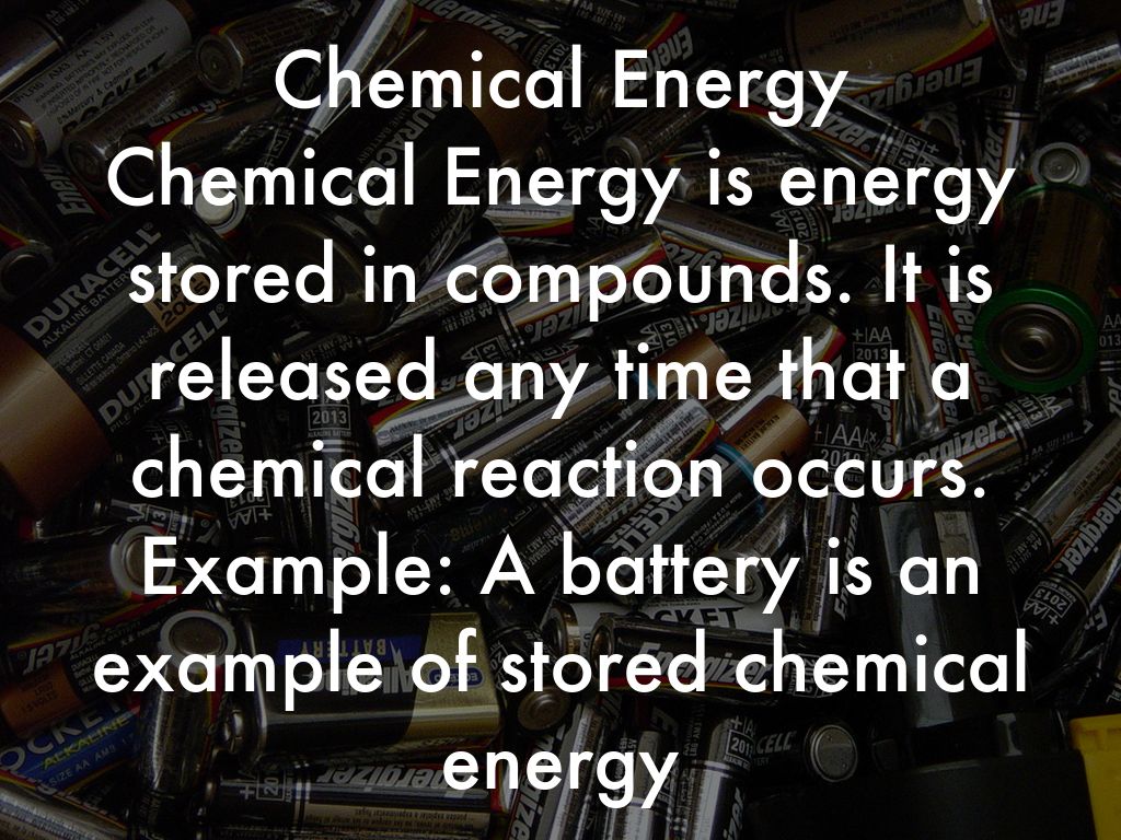 Chemical Energy Chemical Energy is energy stored in compounds. It is released any time that a chemical reaction occurs. Example: A battery is an example of stored chemical energy
