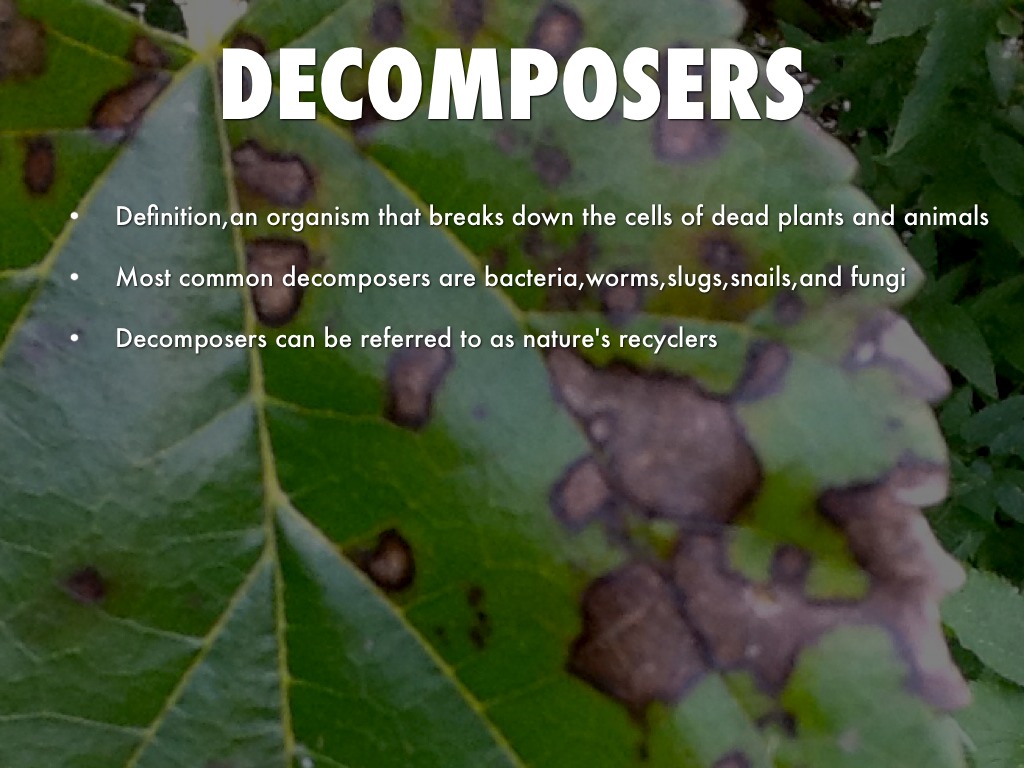 Most common decomposers are bacteria,worms,slugs,snails,and fungi