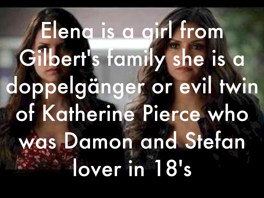 Elena is a girl from Gilbert's family she is a doppelgänger or evil twin of Katherine Pierce who was Damon and Stefan lover in 18's