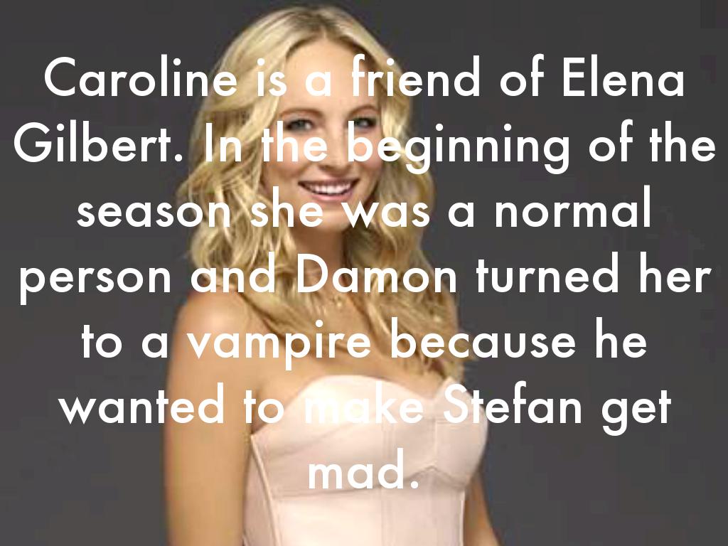 Caroline is a friend of Elena Gilbert. In the beginning of the season she was a normal person and Damon turned her to a vampire because he wanted to make Stefan get mad.