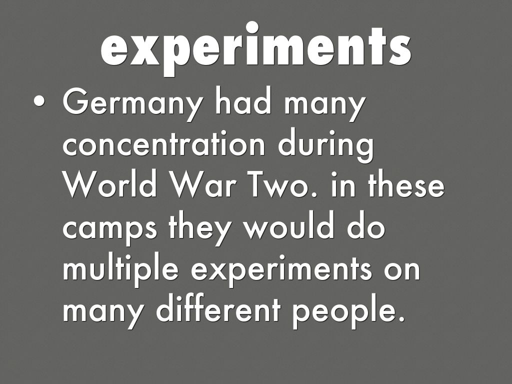 Germany had many concentration during World War Two. in these camps they would do multiple experiments on many different people.