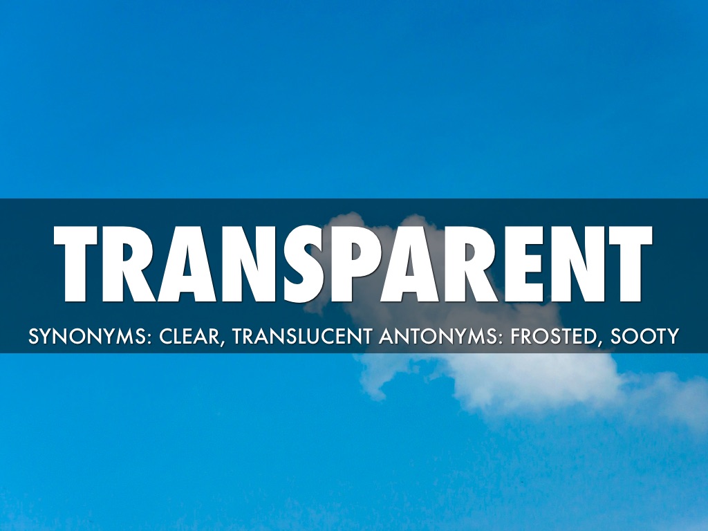 SYNONYMS: CLEAR, TRANSLUCENT ANTONYMS: FROSTED, SOOTY
