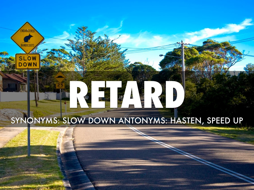 SYNONYMS: SLOW DOWN ANTONYMS: HASTEN, SPEED UP