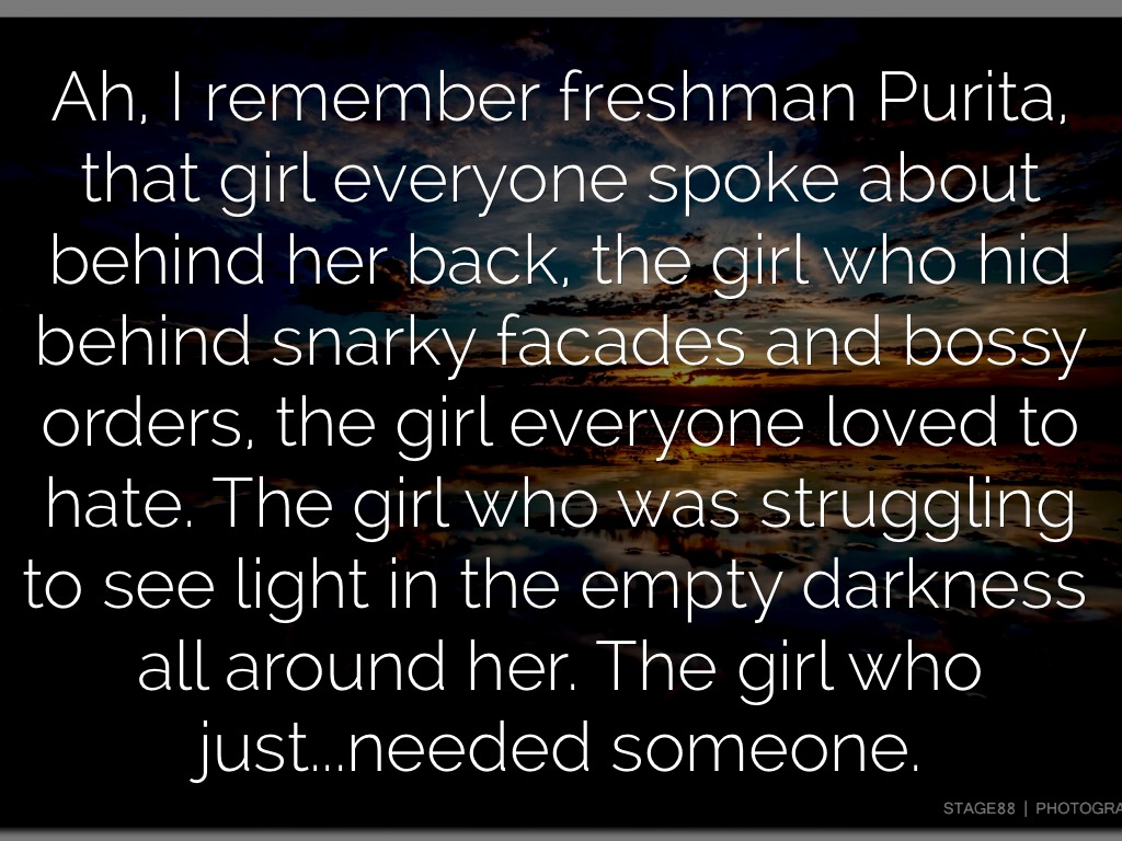 Ah, I remember freshman Purita, that girl everyone spoke about behind her back, the girl who hid behind snarky facades and bossy orders, the girl everyone loved to hate. The girl who was struggling to see light in the empty darkness all around her. The girl who just...needed someone.