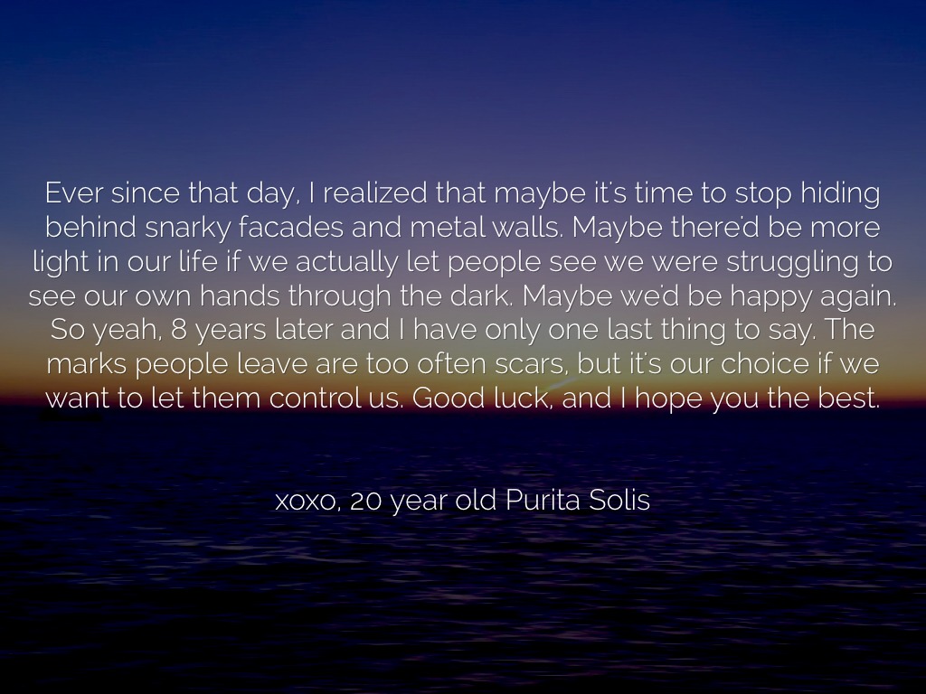 Ever since that day, I realized that maybe it's time to stop hiding behind snarky facades and metal walls. Maybe there'd be more light in our life if we actually let people see we were struggling to see our own hands through the dark. Maybe we'd be happy again. So yeah, 8 years later and I have only one last thing to say. The marks people leave are too often scars, but it's our choice if we want to let them control us. Good luck, and I hope you the best.