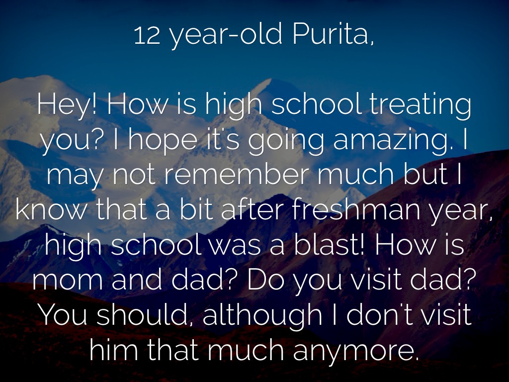 Hey! How is high school treating you? I hope it's going amazing. I may not remember much but I know that a bit after freshman year, high school was a blast! How is mom and dad? Do you visit dad? You should, although I don't visit him that much anymore.