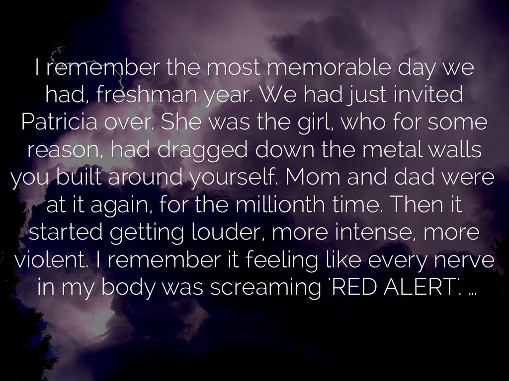 I remember the most memorable day we had, freshman year. We had just invited Patricia over. She was the girl, who for some reason, had dragged down the metal walls you built around yourself. Mom and dad were at it again, for the millionth time. Then it started getting louder, more intense, more violent. I remember it feeling like every nerve in my body was screaming 'RED ALERT'.