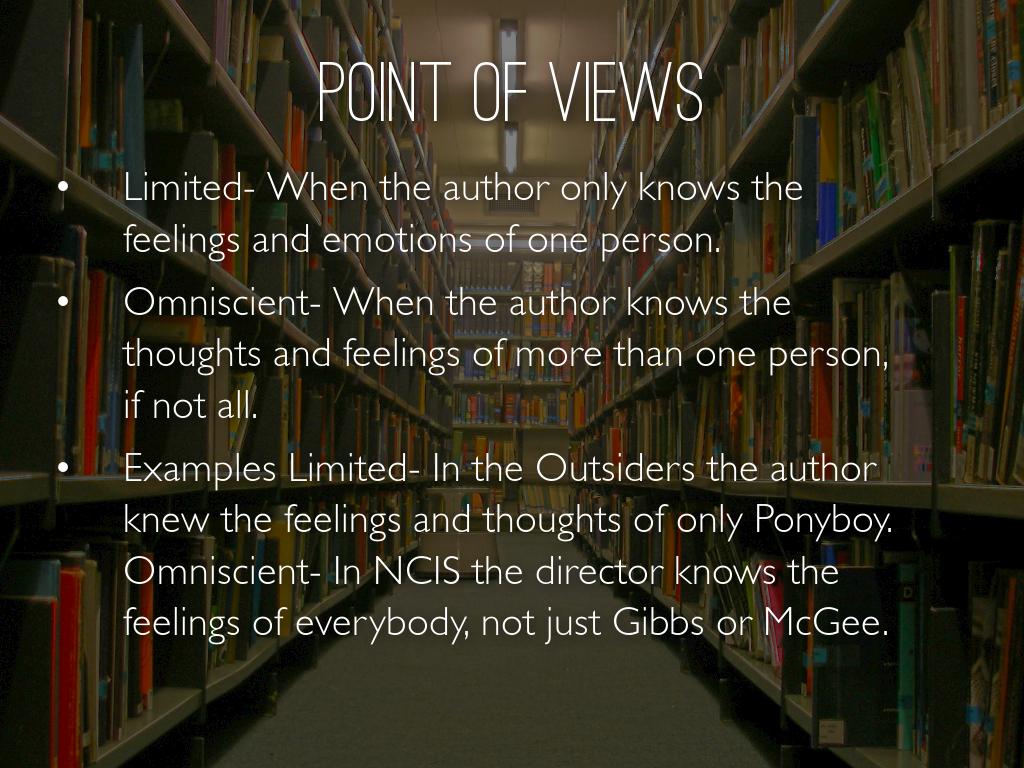 Examples Limited- In the Outsiders the author knew the feelings and thoughts of only Ponyboy. Omniscient- In NCIS the director knows the feelings of everybody, not just Gibbs or McGee.