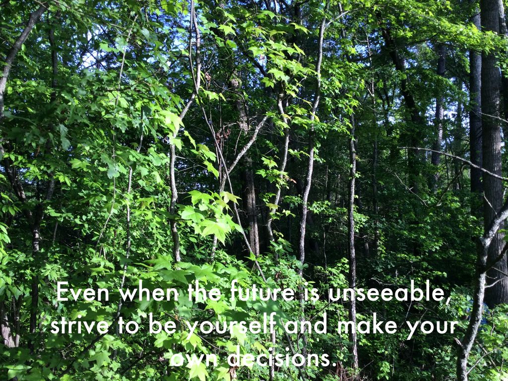 Even when the future is unseeable, strive to be yourself and make your own decisions.