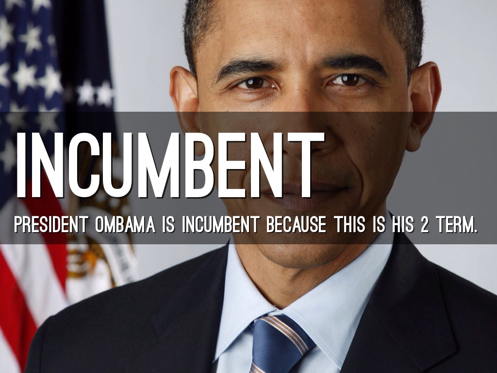 PRESIDENT OMBAMA IS INCUMBENT BECAUSE THIS IS HIS 2 TERM.