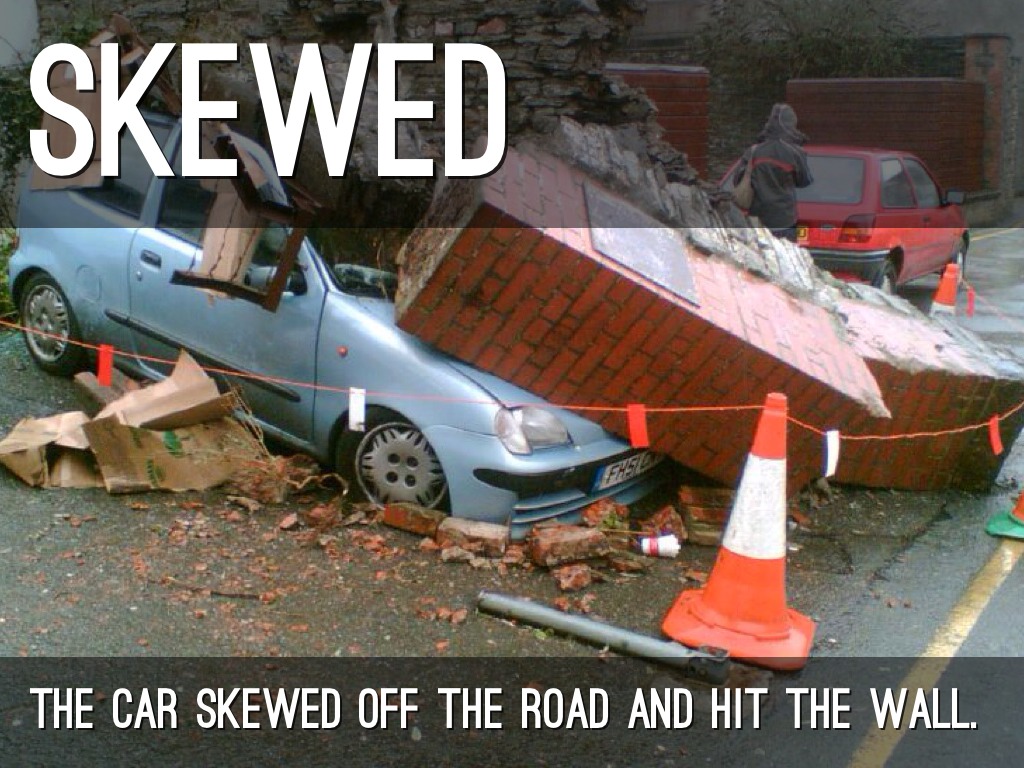 THE CAR SKEWED OFF THE ROAD AND HIT THE WALL.