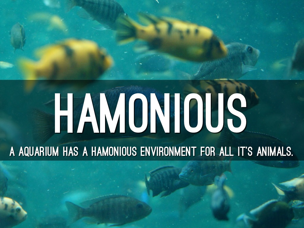 A AQUARIUM HAS A HAMONIOUS ENVIRONMENT FOR ALL IT'S ANIMALS.