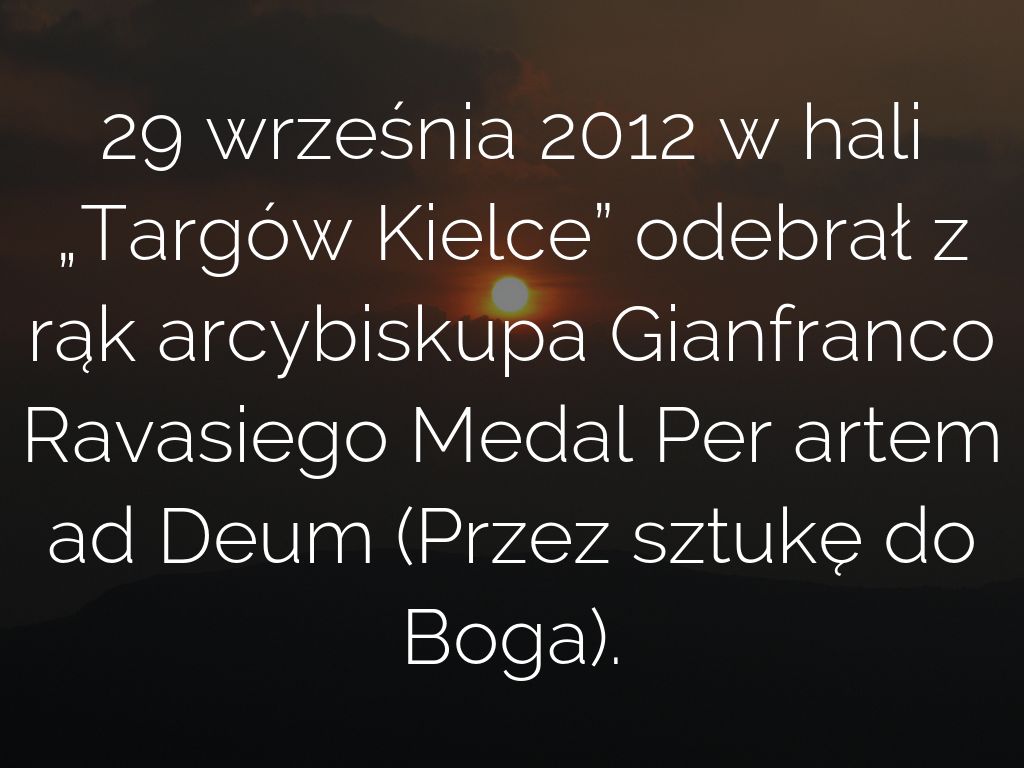 29 września 2012 w hali „Targów Kielce” odebrał z rąk arcybiskupa Gianfranco Ravasiego Medal Per artem ad Deum (Przez sztukę do Boga).